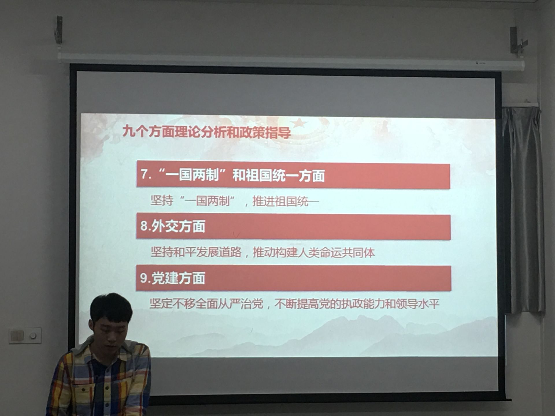 活动首先以胡盛和同志的一曲国际歌拉开了序幕,调动了各党员与预备党员的积极性。蒋昊宸同志详细地介绍了十九大中十个方面的历史性成就,两个重大判断,一个重要思想等,呼吁我们要将智慧与实践结合起来,为社会主义的发展做出贡献。同时,我们需要理解神会主义理论体系,是自己的发展方向不偏离党的宗旨,并不断往正确的方向前进。