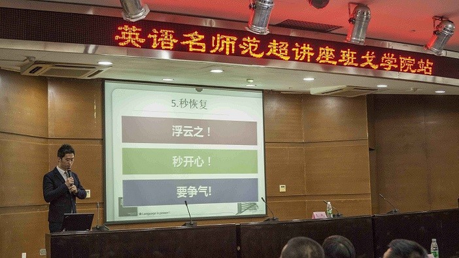 范超老师通过七个关键词,图文并茂地将自己的大学生活及奋斗历程绘声绘色地介绍给在场学生,故事中蕴含的各种英语学习方法和技巧让在场的学生欣然接受。值得一提的是,在整个讲座过程中,范超老师的幽默风趣让所有学生毫无拘束感,会场气氛轻松活泼,笑声和掌声此起彼伏。