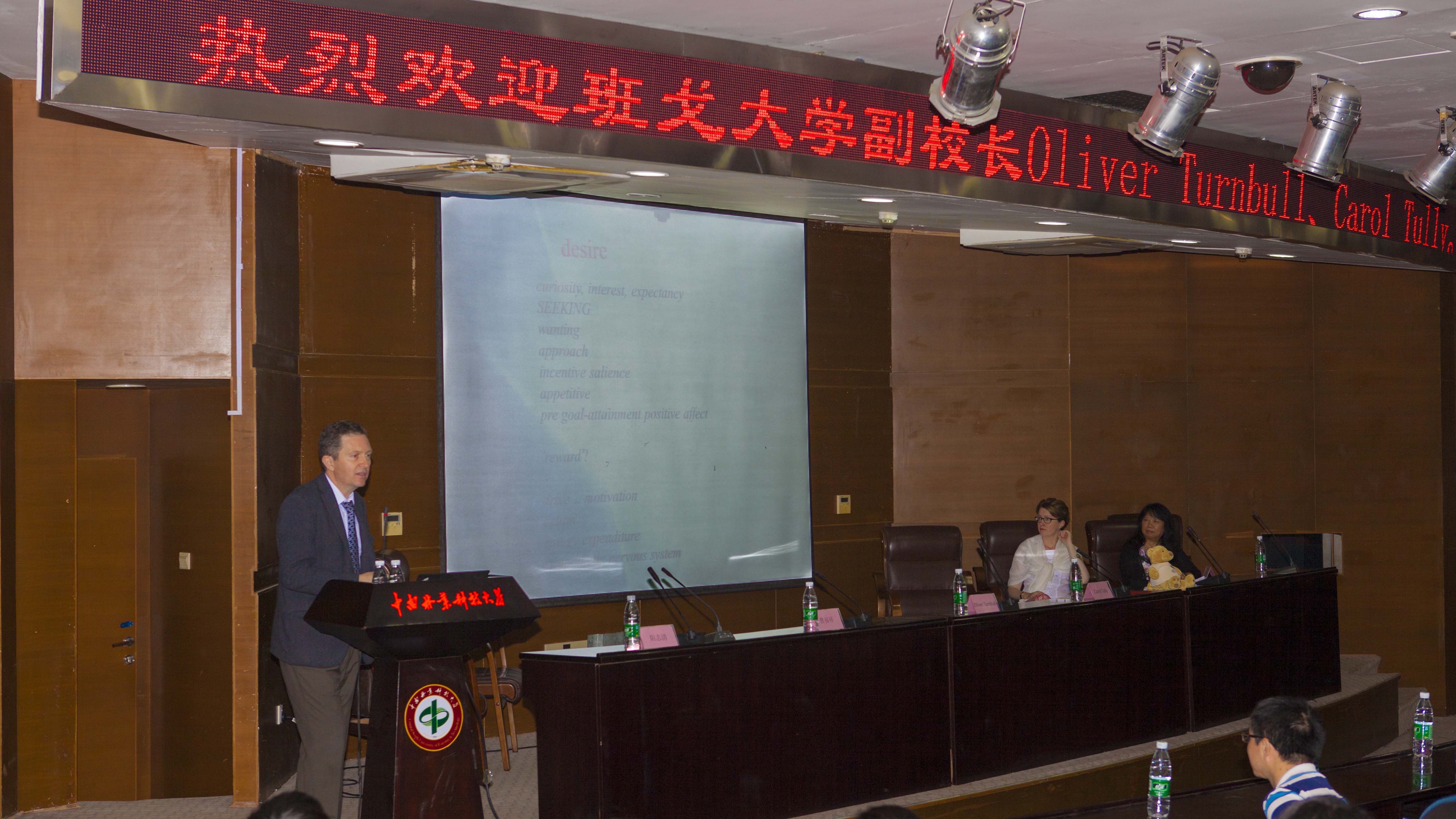 2015年10月21日晚,班戈大学副校长Oliver Turnbull教授 与Carol Tully教授应邀来我校进行学术讲演。