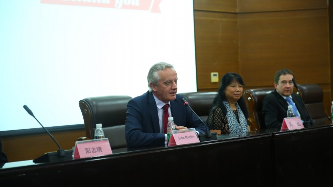到会的嘉宾有班戈大学校长John Hughes教授、班戈大学电子信息工程系主任Iestyn Pierce博士、班戈大学北京办公室主任武晞月主任、班戈学院院长阳志清教授、班戈学院英方副院长凡红教授及其他教师学生代表。到场嘉宾与2015级的同学们一起进行了两个小时的面对面交流与互动。此次交流会分为五个环节,每个环节都非常精彩,嘉宾与同学们都融入其中,营造出一种轻松活泼的氛围。