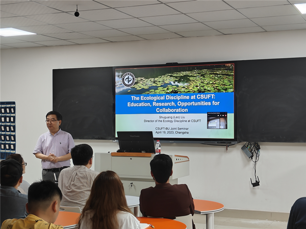 4月19日下午,我校与英国班戈大学联合学术讲座第一期在我院智慧教室德润楼209开讲。学校生态学科带头人刘曙光教授做了“中南林业科技大学生态学科:教育、研究与班戈大学合作前景The ecological discipline at CSUFT: education, research, and opportunities for collaboration”的主题报告。我院林学专业负责人李何副教授、林学专业教师Taimoor Hassan Farooq博士、2022级林学专业学生以及生命科学与技术学院和其他院系部分师生现场聆听了讲座,班戈大学林学系教师Andy Smith、Tim Pagella、Marielle Smith等40余人通过视频会议连线参与。