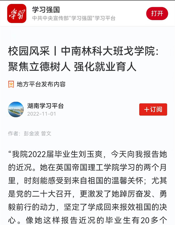“我院2022届毕业生刘玉爽,今天向我报告她的近况。她在英国帝国理工学院学习的两个月里,时刻能感受到来自祖国的温馨关怀;尤其是党的二十大召开,更激发了她踔厉奋发、勇毅前行的动力,坚定了学成回来报效祖国的决心。像她这样报告近况的毕业生有20多个了。” 近日,中南林业科技大学班戈学院2022届毕业生辅导员杜科锦告诉笔者。