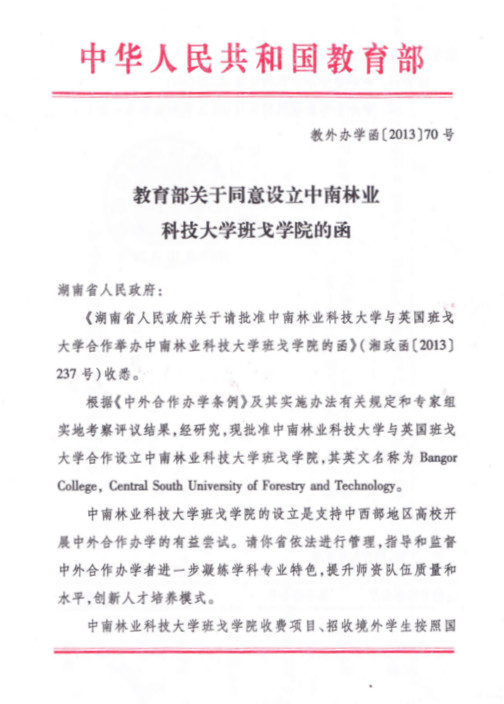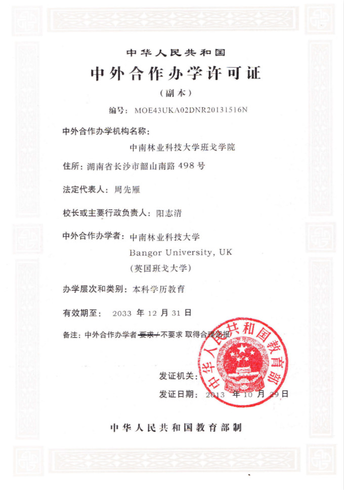 2013年10月,教育部正式下文(教外办学函[2013]70号)批准由中南林业科技大学与英国班戈大学合作建立非独立法人的中南林业科技大学班戈学院,开展本科层次的高等学历教育,现开设有金融学、会计学、电子信息工程和林学四个本科专业。修满人才培养方案规定全部学分的学生,将被颁发中南林业科技大学本科毕业证书;符合中南林业科技大学学位授予有关规定的学生,将被授予中南林业科技大学学士学位,符合班戈大学学位授予有关规定的学生,将被授予英国班戈大学学士学位。